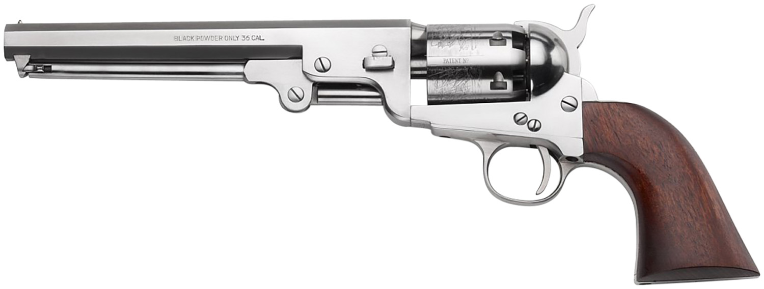 Pietta PF51OS36712 1851 Navy “Old Silver” 36 Cal 7.50″ 6rd Old Silver Frame, & Octagon Barrel, Walnut Grip