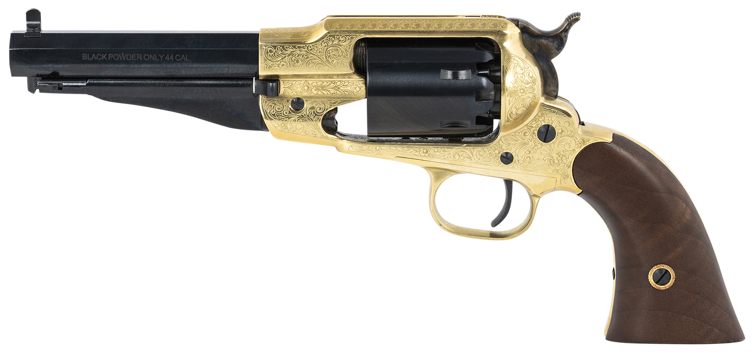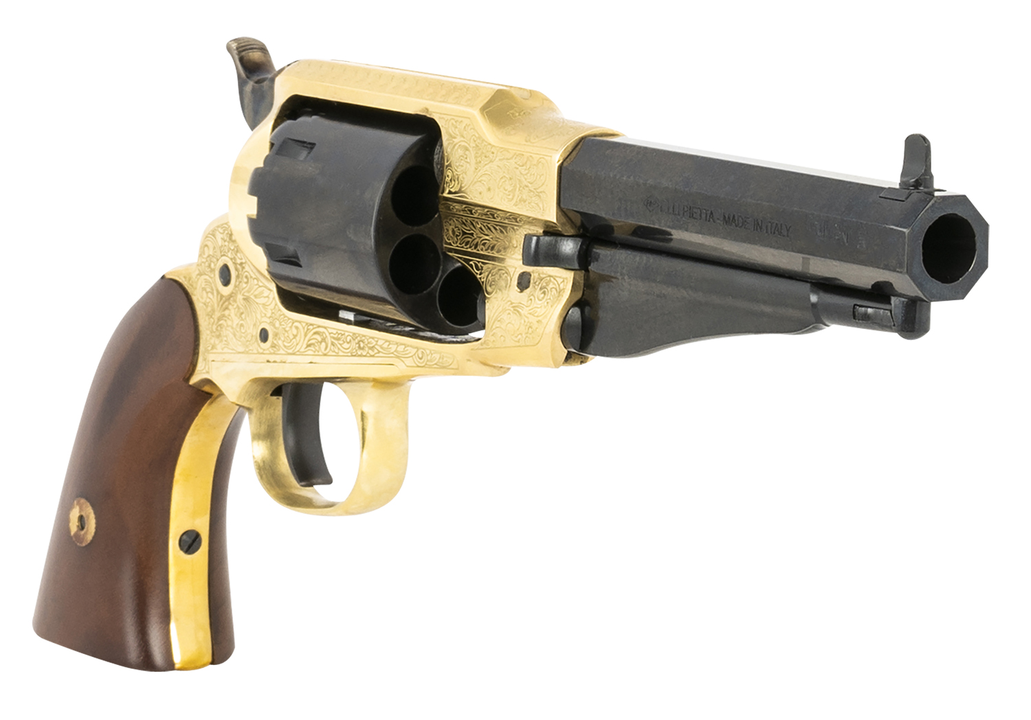 Pietta PF58BRE44512 1858 Sheriff 44 Cal 5.50″ 6rd Brass Frame Engraved Brass Frame, Blued Engraved Cylinder, Blued Engraved Steel, Barrel Walnut Grip