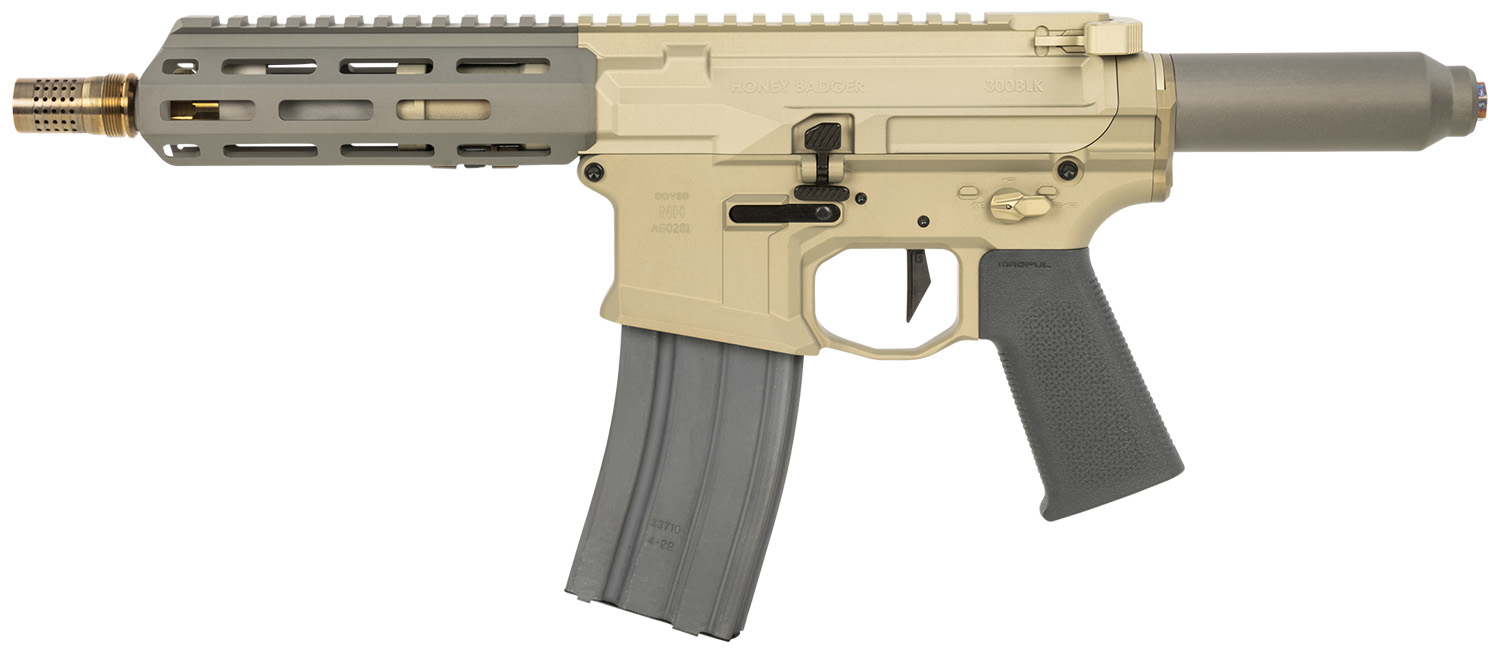 Q LLC HB300BLK7PISTOLNB Honey Badger 300 Blackout 30+1 7″ Black Barrel, Flat Dark Earth Receiver, Black Straight Buffer Tube, Black Polymer Grips Right Hand