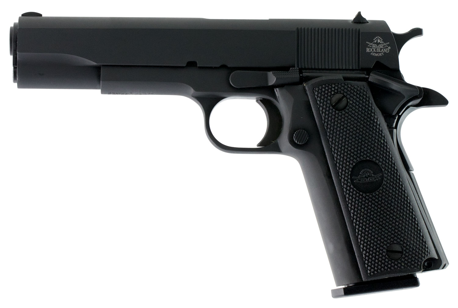 Rock Island 51453 GI Standard FSHC *CA Compliant 45 ACP Caliber with 5″ Barrel, 10+1 Capacity, Overall Black Parkerized Finish Steel, Beavertail Frame, Serrated Slide & Black Rubber Grip