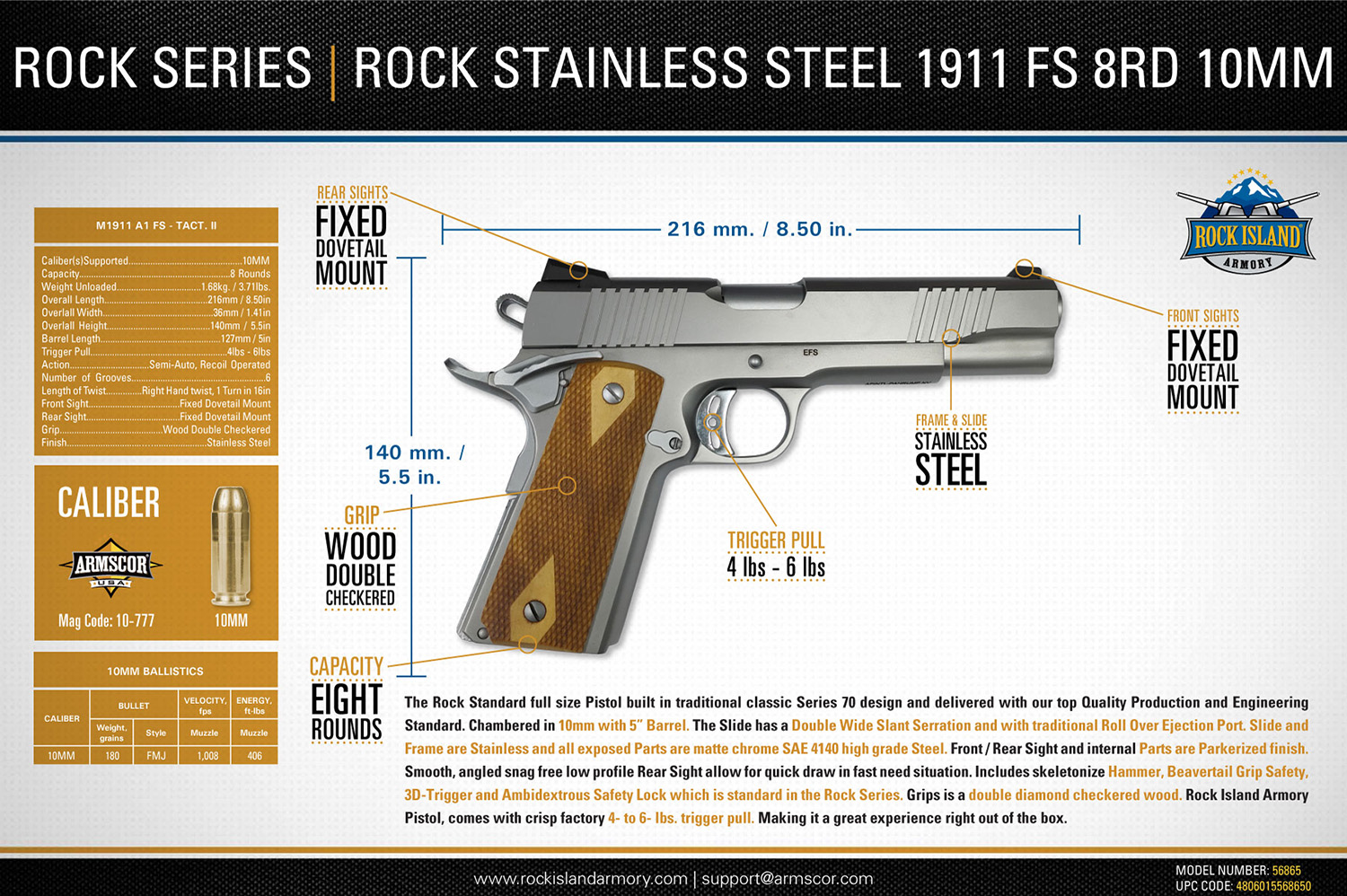 Rock Island 56865 Rock Standard FS Full Size 10mm Auto 8+1 5″ Stainless Steel Barrel & Serrated Slide, Matte Stainless Steel Frame w/Beavertail, Wood Double Checkered Grip