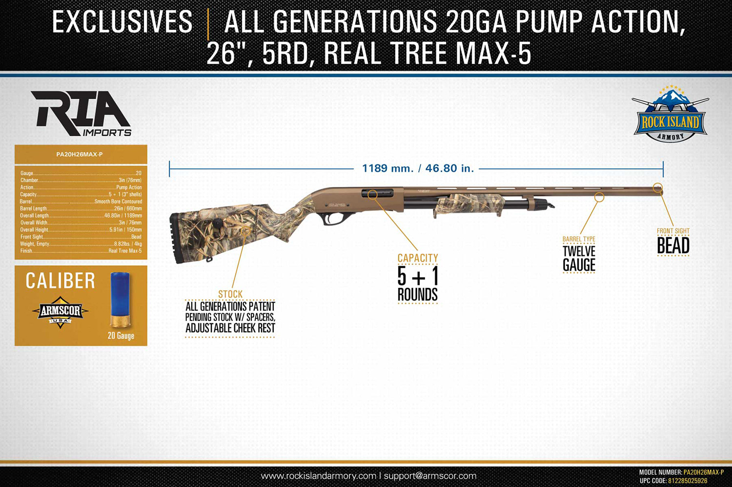 Rock Island PA410H26MAXP All Generations 410 Gauge 3″ 5+1 26″, Bronze Barrel/Rec, Realtree Max-5 Synthetic Furniture, Bead Front Sight, 3 Chokes Included