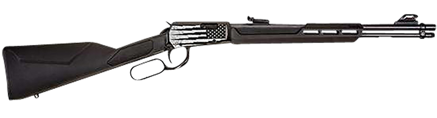 Rossi RL22W201SYEN18 Rio Bravo Full Size, Lever Action 22 WMR 12+1, 20″ Polished Black Steel Barrel, Polished Black w/Lighting US Flag Engraving Steel Receiver, Black Fixed Stock, Right Hand