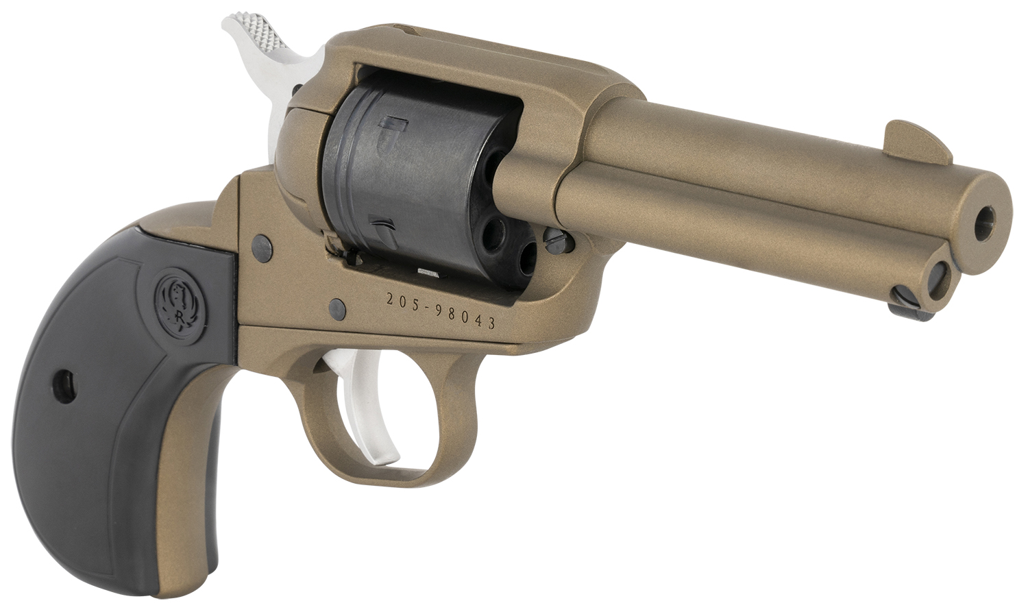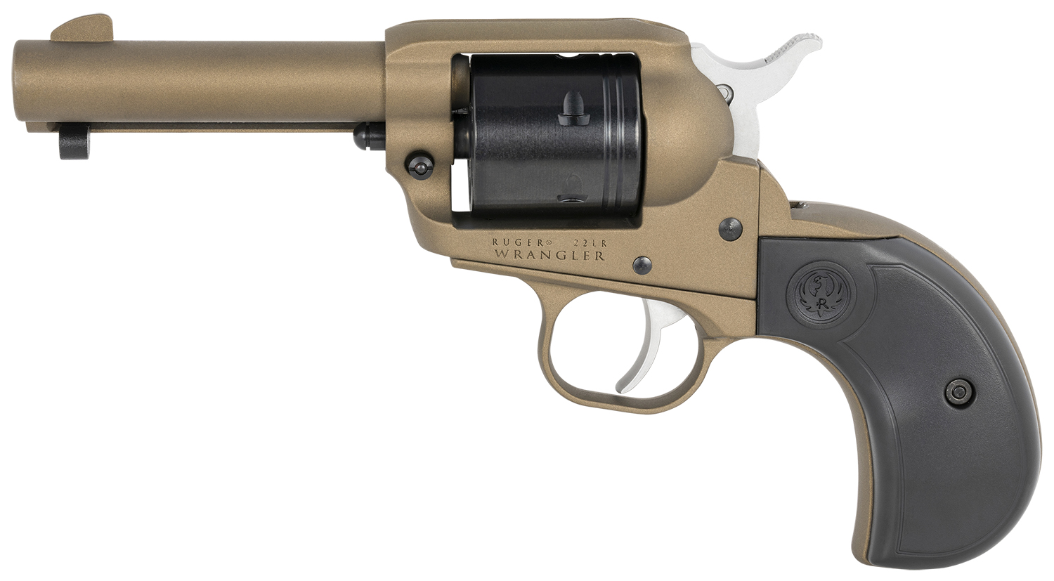 Ruger 2017 Wrangler 22 LR 3.75″ Burnt Bronze Cerakote Barrel & Frame, 6 Shot Black Cerakote Cylinder, Synthetic Grip On A Birdshead Pattern Grip Frame Grip, Transfer Bar Safety