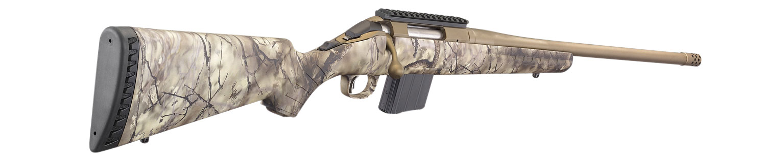 Ruger 26986 American Full Size 350 Legend 5+1 22″ Burnt Bronze Cerakote Threaded Barrel, Picatinny Rail Steel Receiver, GoWild Camo I-M Brush Fixed Synthetic Stock, Right Hand