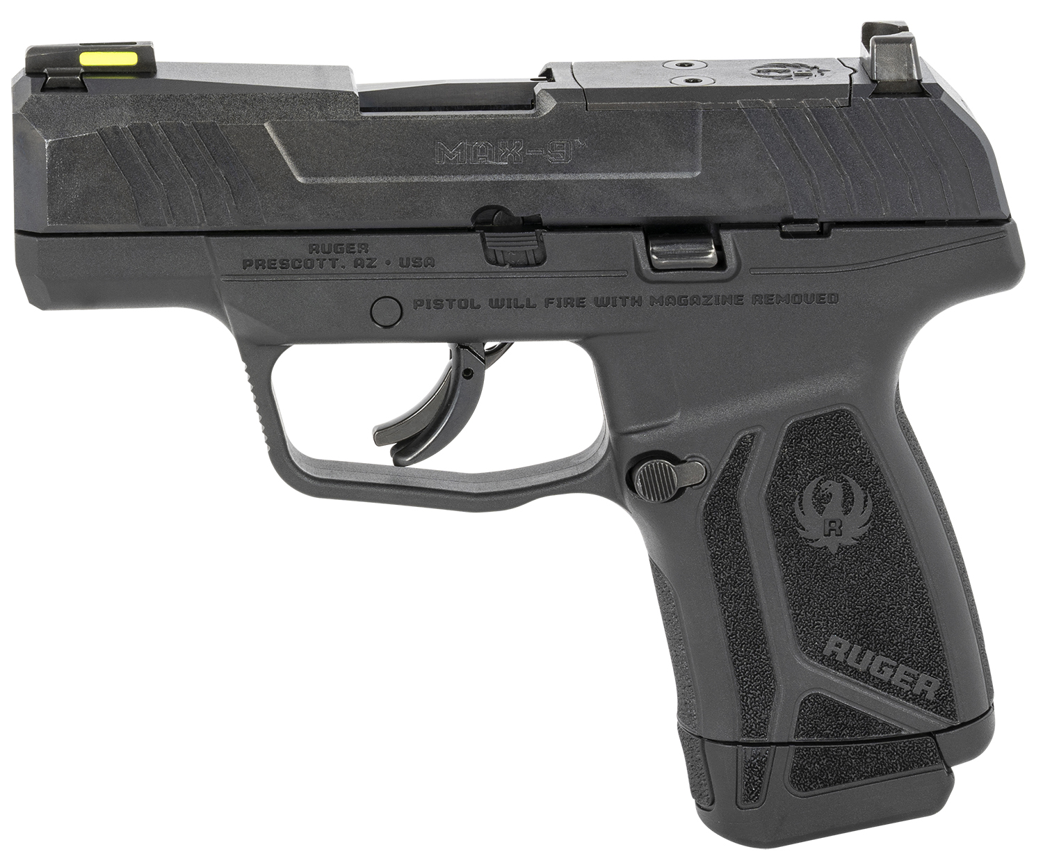 Ruger 3503 Max-9 Optic Ready 9mm Luger 3.20″ Barrel 10+1 Or 12+1, High Performance Glass-Filled Nylon Grip Frame, Optic Cut Through-Hardened Steel Slide, Polymer Grip & No Manual Safety