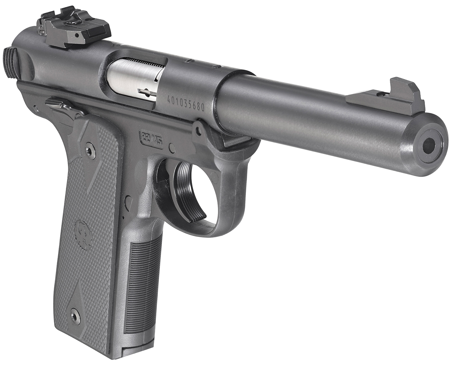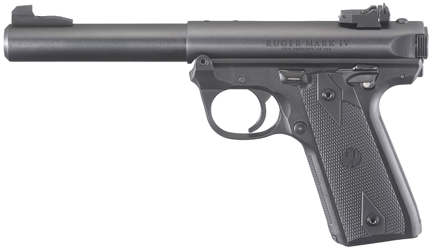 Ruger Mark IV 22/45 22 LR 10+1, 5.50″ Stainless Bull Barrel, Blued Drilled & Tapped Steel Receiver & Polymer Frame, Black Checkered Polymer Grip Ambidextrous