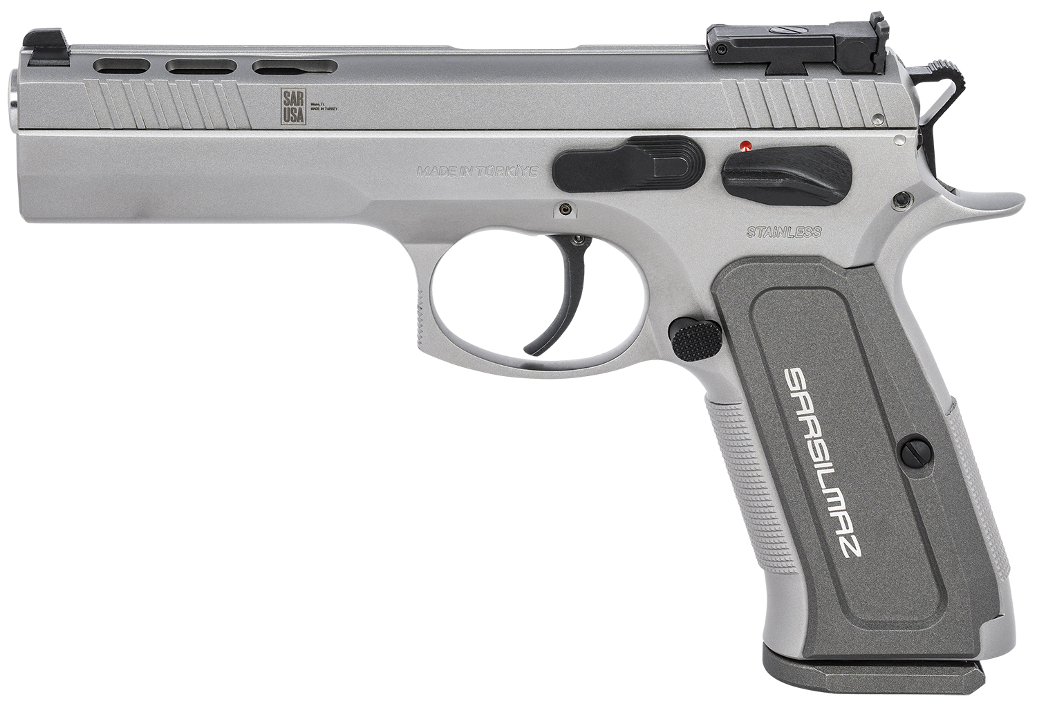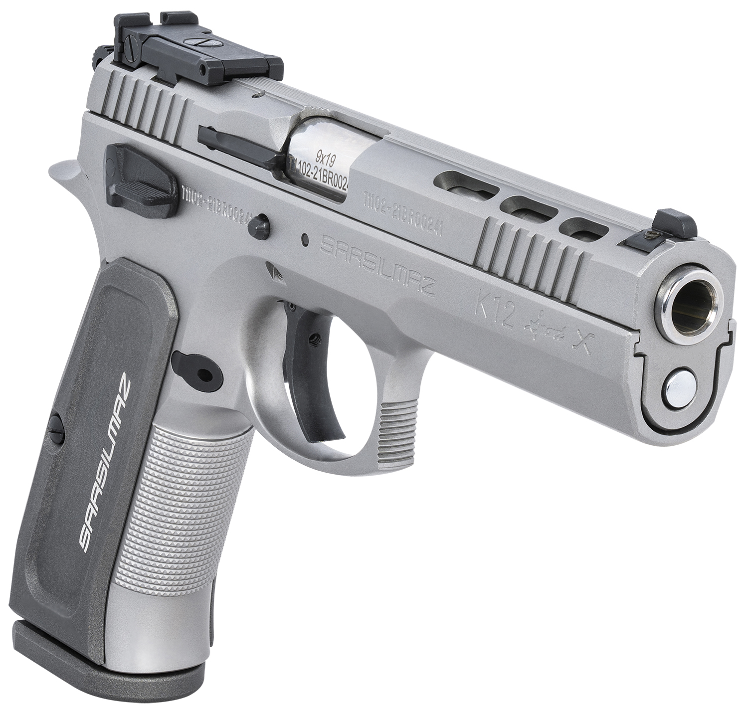 SAR USA K12STSPX K12 Sport X Duty 9mm Luger Caliber with 4.70″ Barrel, 17+1 Capacity, Overall Matte Stainless Finish Steel, Beavertail Frame, Serrated/Ported Slide & Gray Polymer Grip