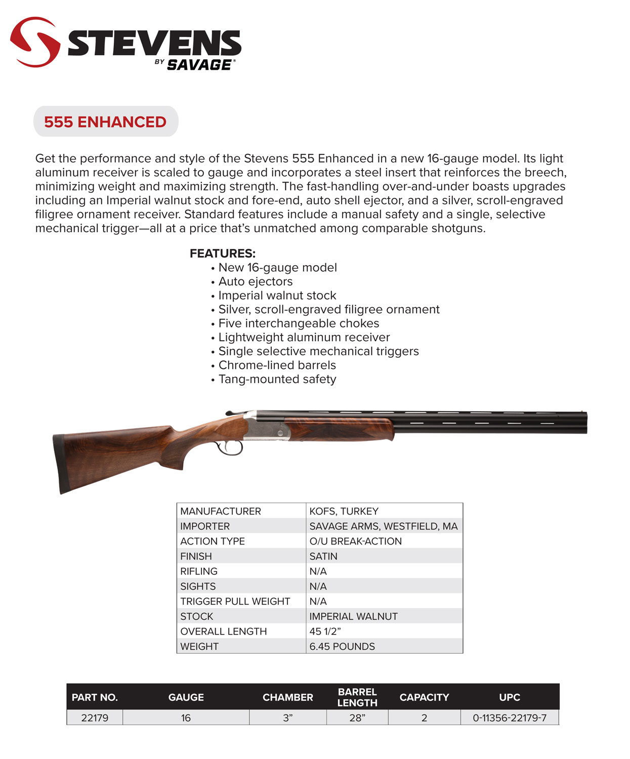 Stevens 22179 555 E 16 Gauge 3″ 28″ Over/Under Vent Rib Barrel, Silver Engraved Receiver, Oiled Turkish Walnut, Includes Five Chokes, Ambidextrous Hand