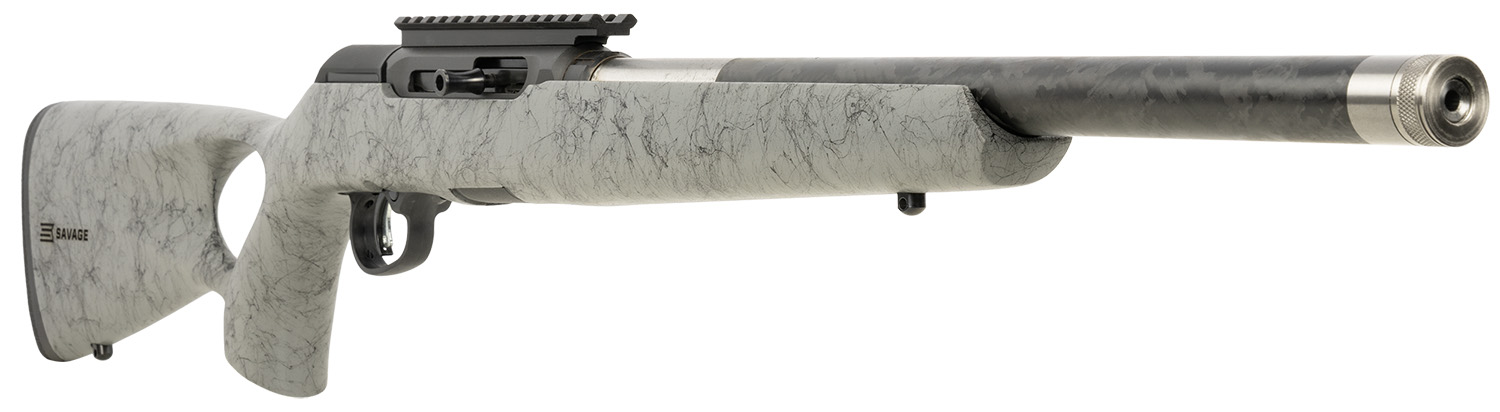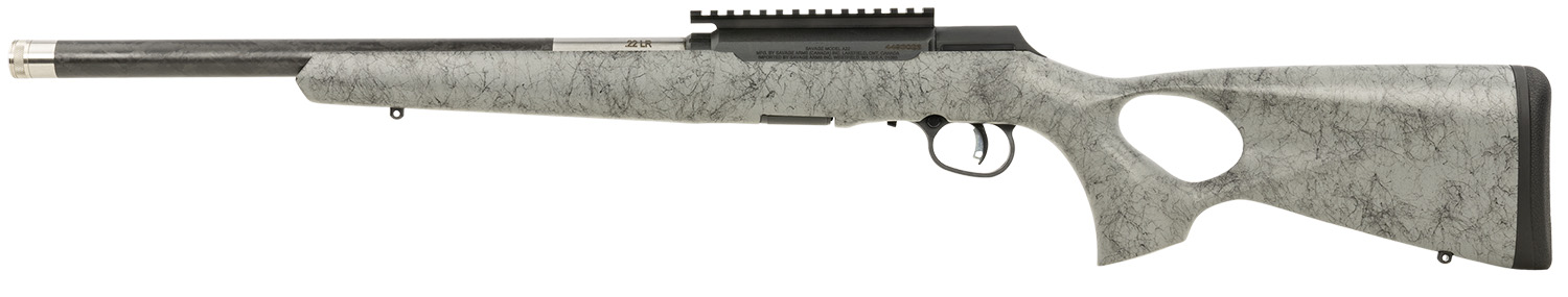 Savage Arms 47253 A Series TimberLite 22LR 10+1 18″ Black Threaded Carbon Fiber/SS Barrel, Black Picatinny Rail Steel Receiver, Gray w/Black Webbing Synthetic Fixed Thumbhole Stock