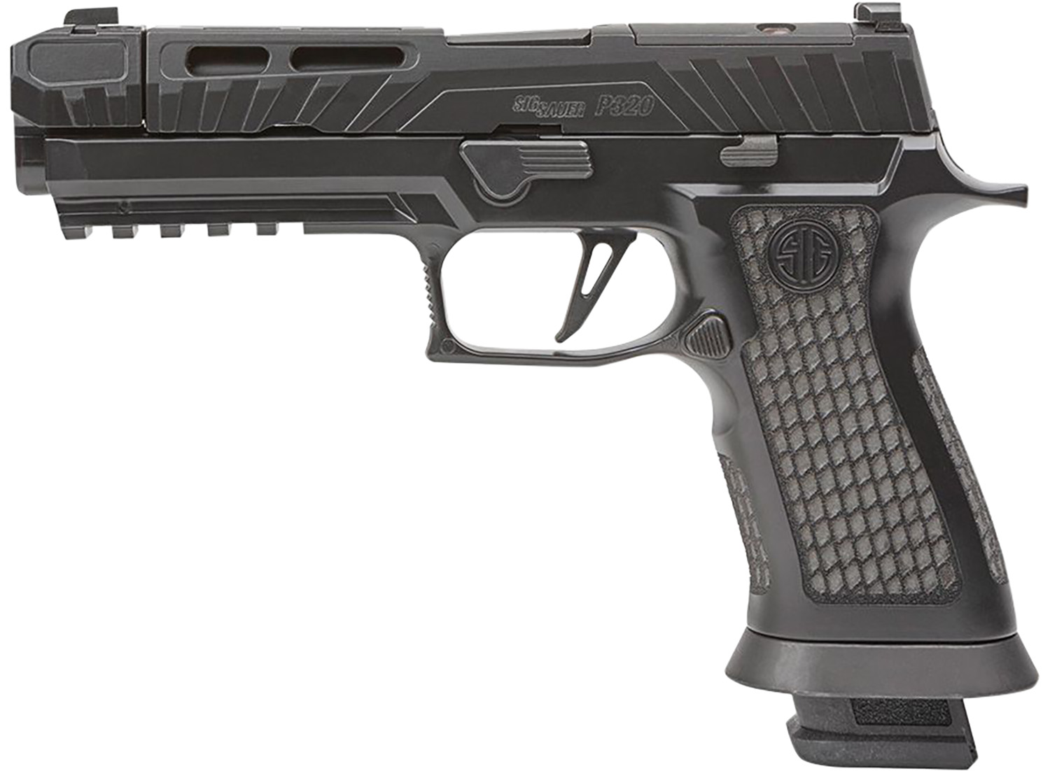 Sig Sauer P320V004 P320 9mm Luger 21+1 4.60″ Black Steel Threaded Barrel, Black Cerakote Optic Cut/Serrated Slide, Black Laser Engraved XSeries Grips