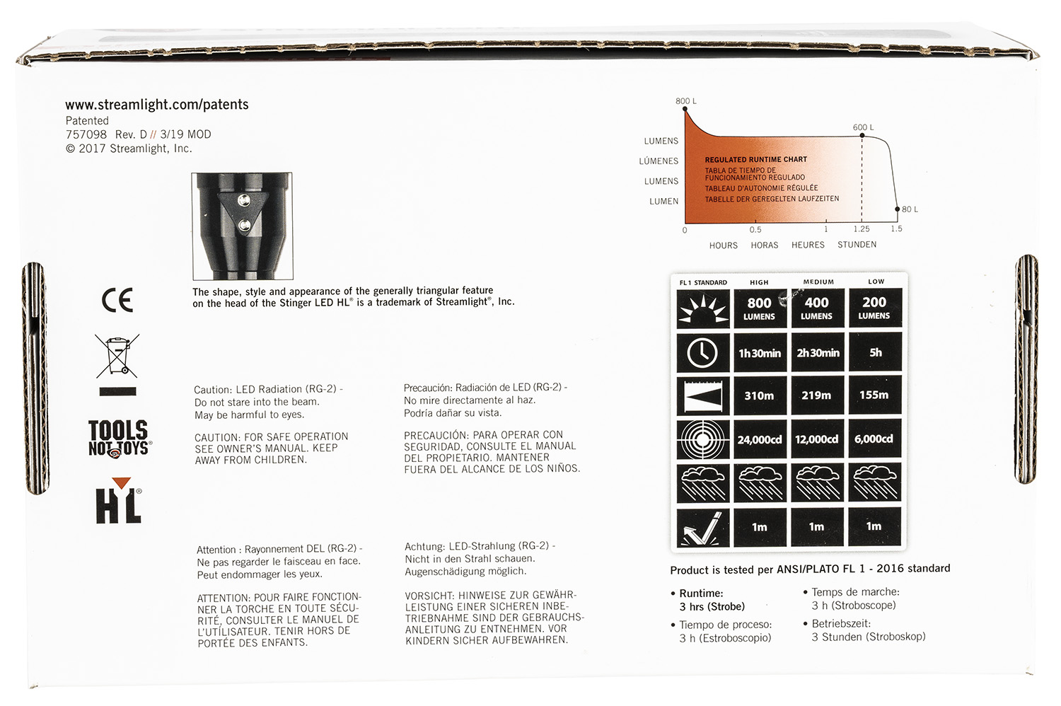 Streamlight 75431 Stinger LED HL Flashlight Black Anodized 200/400/800 Lumens White C4 LED