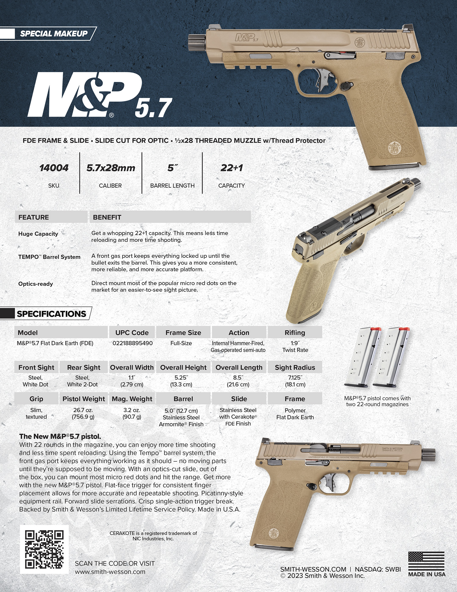 S&W M&P 5.7 14004 5.7X28 OR 5 (2)22R FDE