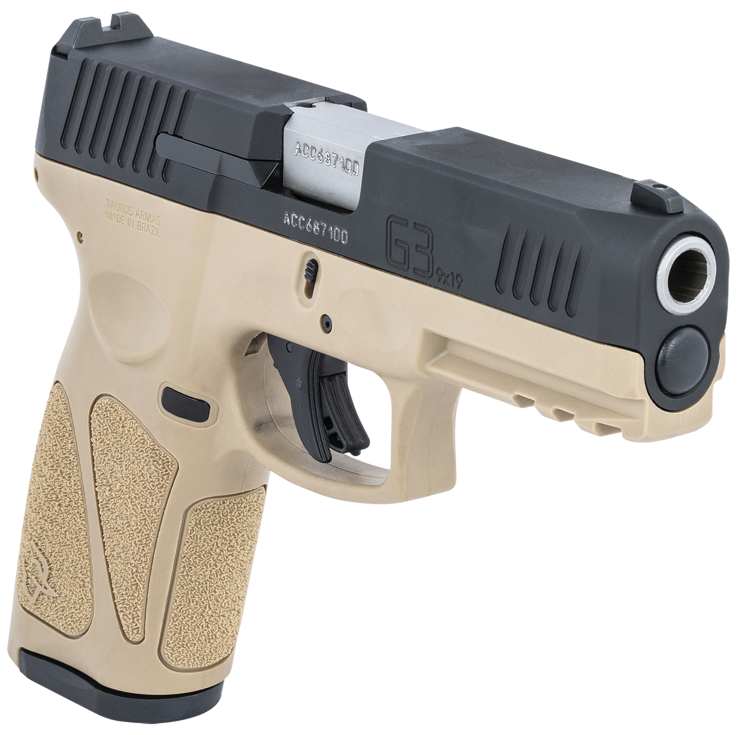 Taurus 1G3B941T G3 9mm Luger 15+1 Or 17+1 4″ Matte Stainless Steel Barrel, Tan Polymer Frame With Picatinny Acc. Rail, Tenifer Matte Black Steel Slide, Re-Strike Capability, Manual Safety