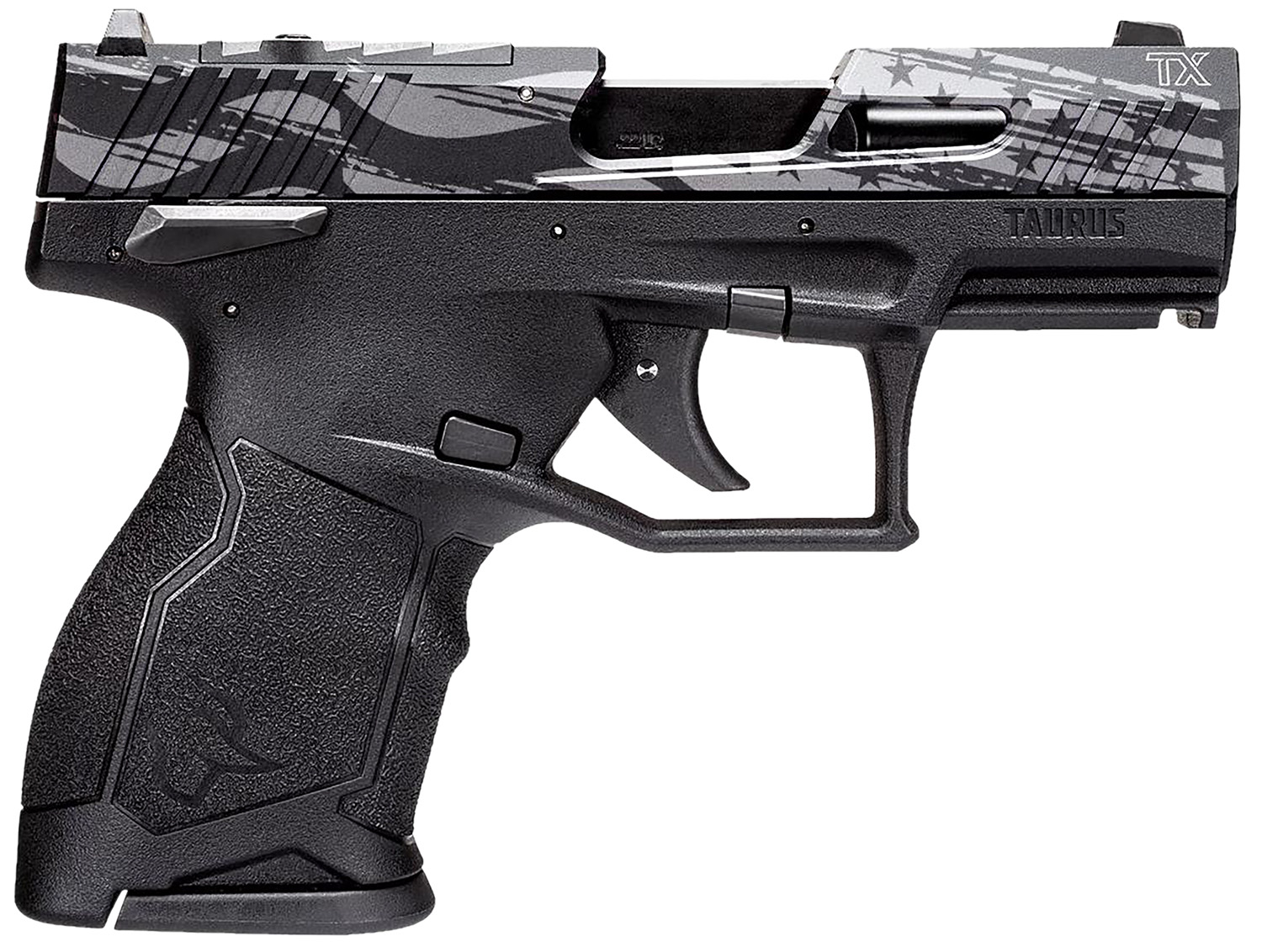 Taurus 1TX2233110US5 TX22C T.O.R.O. Compact Frame 22 LR 10+1 3.60″ Matte Black Steel Barrel, Engraved Distressed USA Flag Optic Ready/Serrated Slide, Black Polymer Frame