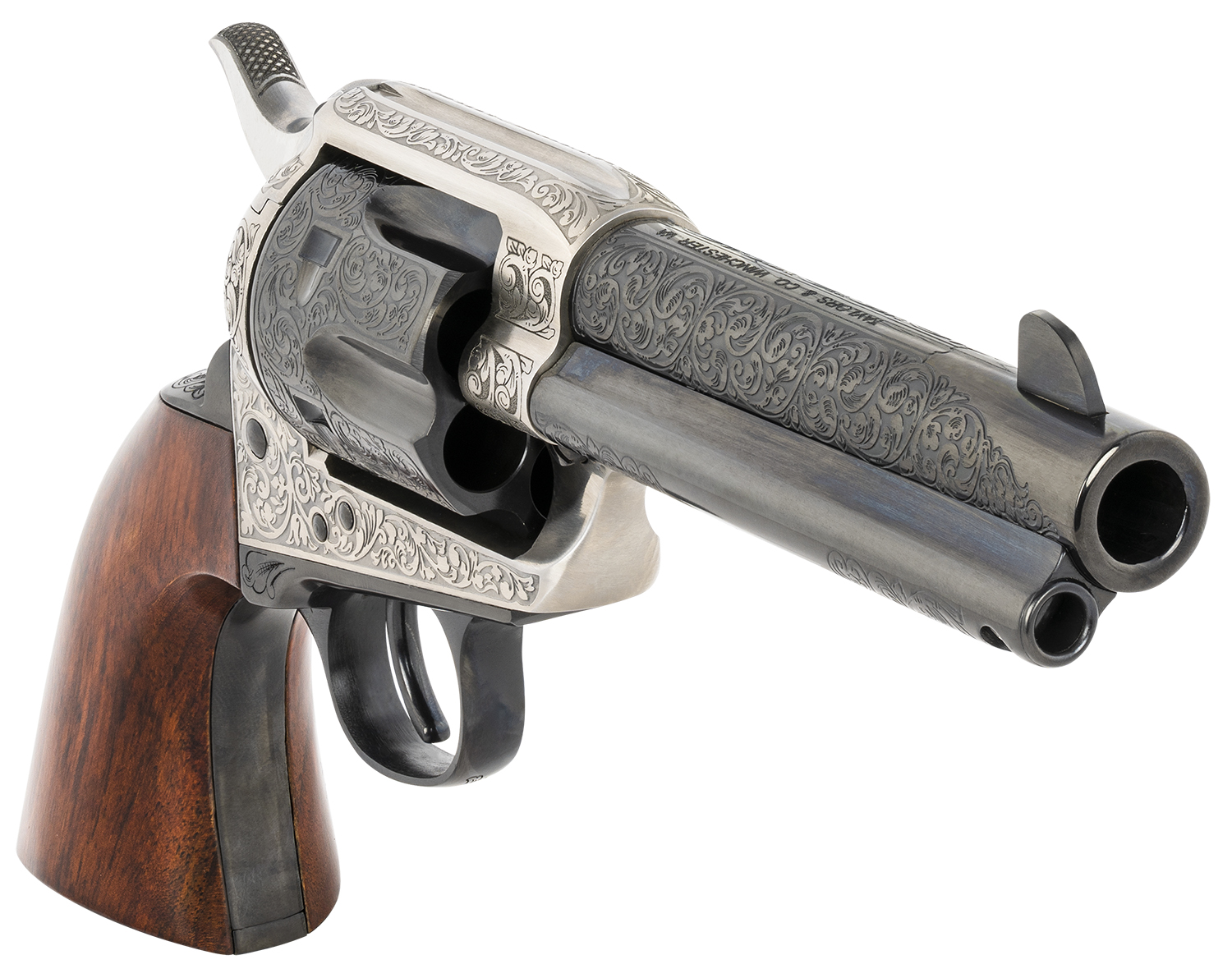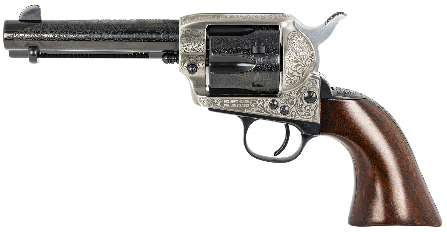 Taylors & Company 550925 1873 Cattleman 45 Colt (LC) Caliber with 4.75″ Blued Floral Engraved Finish Barrel, 6rd Capacity Blued Finish Cylinder, Coin Photo Engraved Finish Steel Frame & Walnut Grip