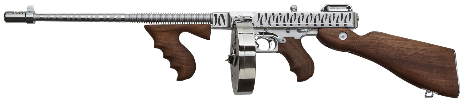 Thompson T150DCRTS 1927A-1 Deluxe 45 ACP Caliber with 16.50″ Barrel, 20+1 Capacity (Stick), 50+1 Capacity (Drum), Hard-Chrome w/Tiger Stripe Metal Finish, American Walnut Stock Wood Grip Right Hand