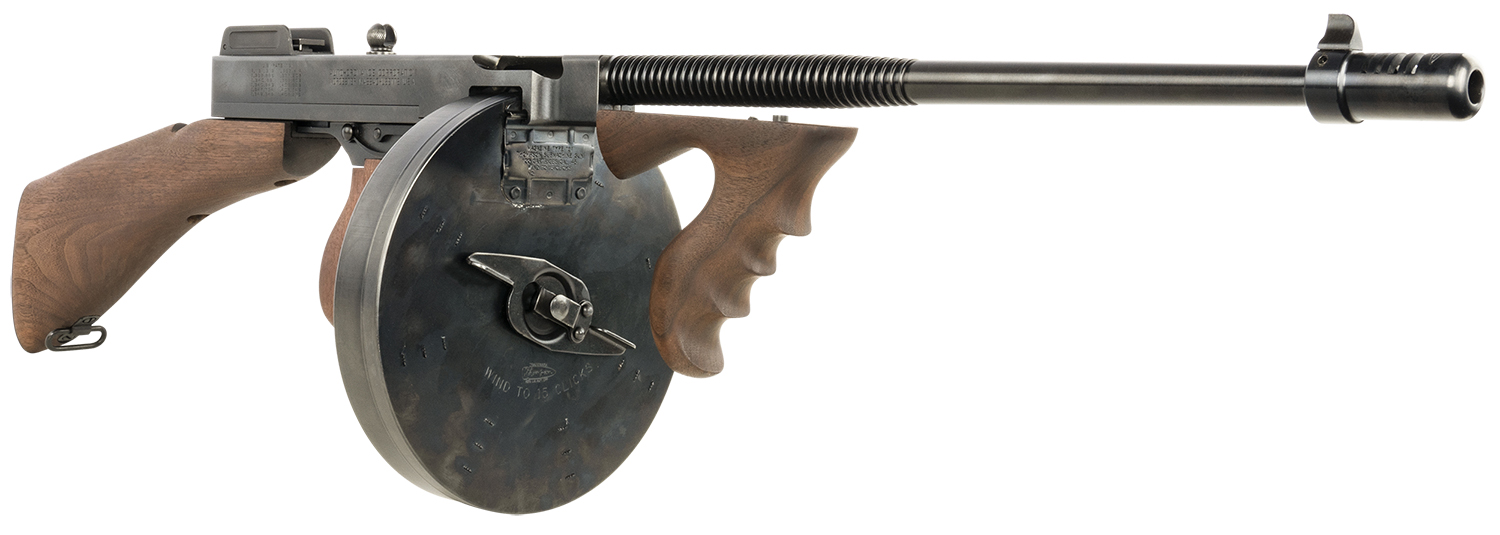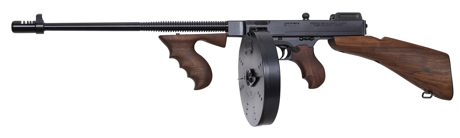 Thompson T1B100D 1927A-1 Deluxe Carbine 45 ACP Caliber with 18″ Barrel, 20+1 Capacity (Stick), 100+1 Capacity (Drum), Blued Metal Finish, American Walnut Removable Fixed Stock & Wood Grip Right Hand