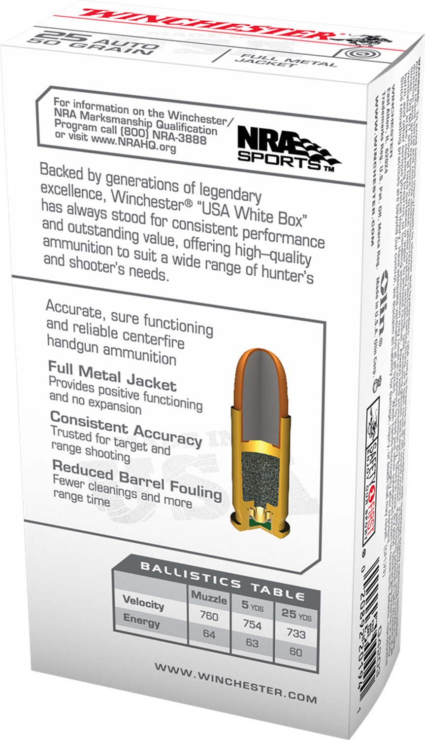 Winchester Ammo Q4203 USA 25ACP 50gr Full Metal Jacket 20 Per Box/10 Case