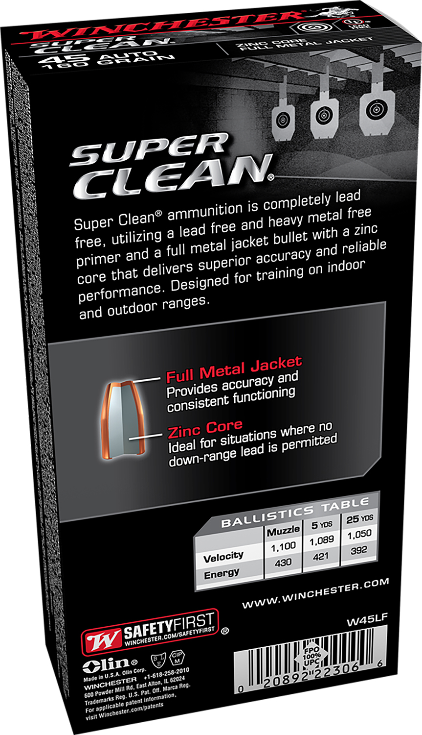 Winchester Ammo W45LF Super Clean 45ACP 160gr Lead Free Full Metal Jacket 50 Per Box/10 Case